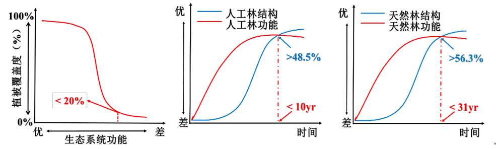 (3)修复生态学:发现黄土丘陵区人工植被耗水量是降水量的1.4倍,人工造林地0~6m土壤含水量较自然恢复减少37.2%、地表径流减少57~96%;人工造林七年后地表植被覆盖度比自然恢复样地低30.5%、植物种类少52.1%;认为人工造林尽管增加了森林覆盖度,但由于对水分的过度消耗,导致土壤干旱、地表植被盖度下降、植物多样性降低。因此,干旱半干旱地区退化生态修复应以自然恢复为主、人工干预为辅。